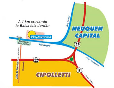 Mapa del lugar proporcionado por los organizadores de Playaventura.Se encuentra en el Alto Valle de Río Negro y Neuquén, una zona que funciona como corredor hacia la cordillera, donde en verano el clima es muy caluroso y bien vale la pena pernoctar en la región para disfrutar de los balnearios del río Negro o en el lago Pellegrini, cerca de Cinco Saltos. En primavera la zona se convierte en un paraíso cuando los manzanos y perales están en flor.