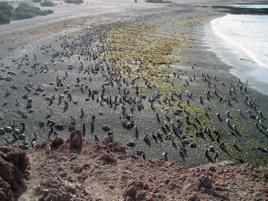 Con su característico andar los pingüinos emergen del mar y se dirigen a su nidos.Un pingüino adulto mide unos 50 centímetros y pesa unos 5 kilogramos. El plumaje que caracteriza a la especie es el pecho blanco, lomo negro y un doble collar blanco y negro. La vocalización de los pingüinos adultos parece un rebuzno. La utilizan para alejar a los extraños y atraer a su pareja. En cambio los pichones, con un piar sibilante y continuado, piden su merecido alimento.