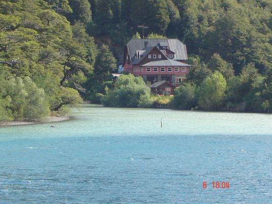 Hotel de Puerto Blest, se puede notar la desembocadura del río en el brazo Blest del L. Nahuel Huapi y la diferencias de aguas.